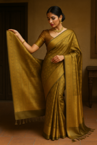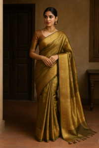 The rich olive-gold tone drapes effortlessly, making it perfect for weddings, festive occasions, and elegant gatherings. Each thread tells a story of craftsmanship, ensuring that no two sarees are ever exactly alike.